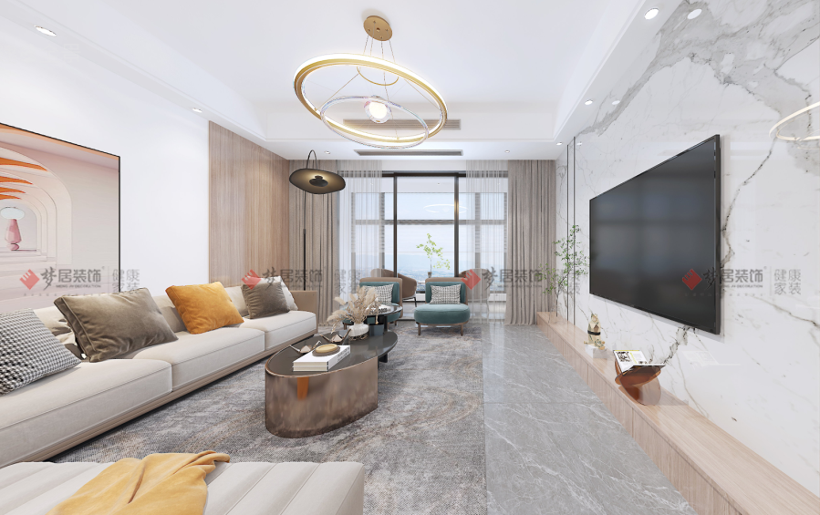 | 設(shè)計說明:本案定位現(xiàn)代風格,整個空間色調(diào)以暖色為主,餐廳以簡約、大方、時尚、舒適為主要表達方向,空間輕盈,動線流暢,整體設(shè)計感互為呼應(yīng)??蛷d電視背景墻以大理石做整面墻的鋪貼處理,大理石紋的灰色和白色交織;一張舒適柔軟的米色沙發(fā),帶來自在優(yōu)雅;除了主光源之外,時尚的燈具點綴著居室,讓室內(nèi)氛圍加分不少,為業(yè)主帶來一份精致的美好。主臥陳設(shè)舒緩放松,簡約明快的色調(diào)搭配簡潔舒適;兒童房緊湊貼合,背景墻以可愛雅致的豆粉色和白色做雙色疊拼,同時在衣柜柜體上做套色呼應(yīng),整體效果上很是可愛精致。 | |||
