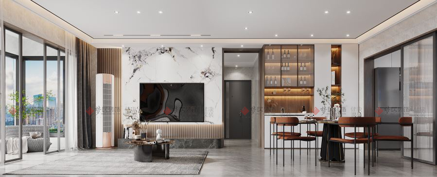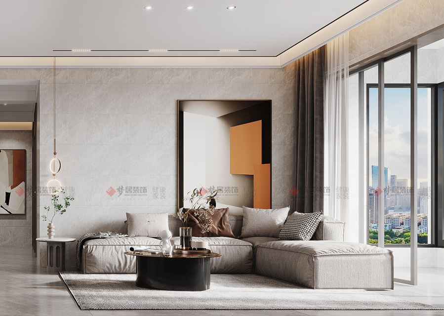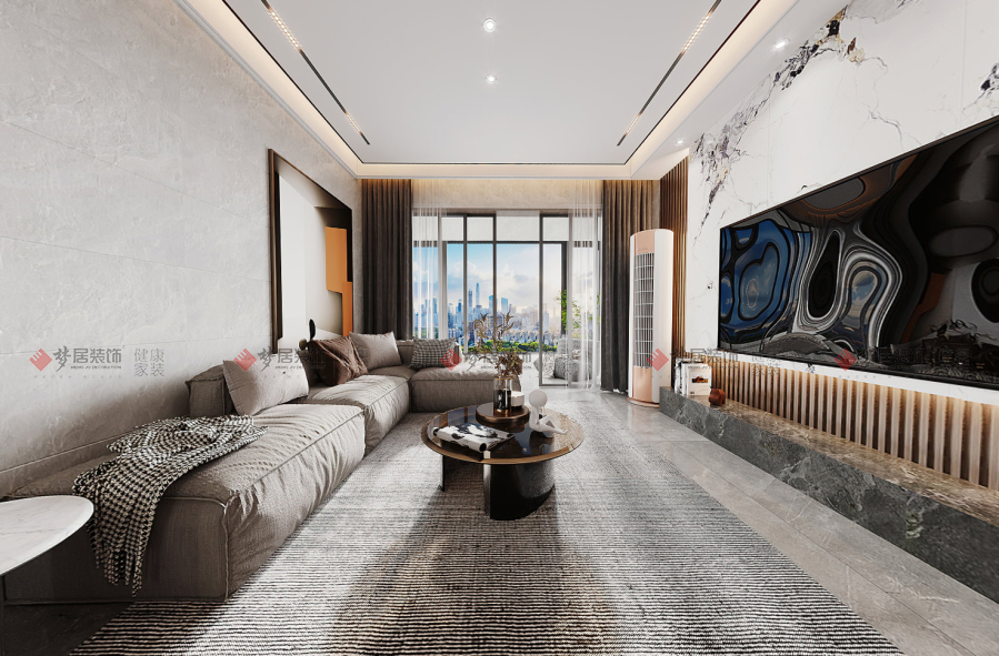 | 設(shè)計說明:本案客廳采用“無主燈”設(shè)計,整體為現(xiàn)代風(fēng)格設(shè)計手法,呈現(xiàn)出年輕人所青睞的新時代舒適居所??蛷d用多種燈光營造不同情景的效果,烘托溫馨的氛圍,簡潔、大氣、舒適?;疑y理地磚,利落的金屬線條,偏硬朗的現(xiàn)代風(fēng)格,優(yōu)雅簡潔。舒適的布藝沙發(fā)搭配大幅現(xiàn)代簡約畫作,極具現(xiàn)代感;電視背景墻做木柵格設(shè)計,時尚溫馨;吊頂線型軌道燈設(shè)計,現(xiàn)代感滿滿。餐廳設(shè)計儲納柜,增加儲納空間。臥室采用木地板地面鋪貼更溫馨,簡約的掛畫和時尚的床頭燈做裝飾,空間簡約舒適。 | |||