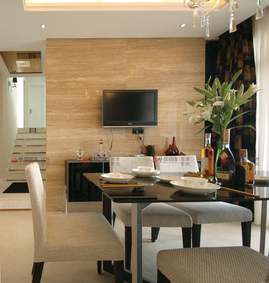 | 設(shè)計說明:主要材料:黃洞石、爵士白大理石、鋼化玻璃、水曲柳索色飾面板、墻紙等。 不銹鋼、灰鏡等家在任何時候都應(yīng)該被當(dāng)作一處風(fēng)景來對待,不僅要有暖人的氣氛,還要有賞心悅目的環(huán)境。方能在居家的溫馨之余,體味看風(fēng)景的心情。無論何時回到家,總能領(lǐng)略到生活的風(fēng)情萬種。 本案的設(shè)計以米色為主題。純凈柔和、散發(fā)溫暖氣息的米色,充斥著你的視野,挑逗著你的神經(jīng)。精心裝點(diǎn)的空間,給人非同尋常的美感,就如同一位時尚的女子在款款走來。優(yōu)雅的氣質(zhì)、清新的外表,以及那一眸清泉般的眼波,無不讓你有驚艷的感覺。相較于其他的色彩,米色顯得更為內(nèi)斂,更為含蓄,但卻不乏激情和浪漫。淺淺的色調(diào),帶著濃濃的情意,將家的意境完美詮釋。 如果說家是一處風(fēng)景,那客廳就是這中間最絢麗的一筆,起著引人入勝的作用。讓你在看到的第一眼欲罷不能,不由得駐足欣賞,流連忘返。走進(jìn)本案的客廳,墻上一副素雅的花卉畫,潔白的蓮花搭配翠綠的荷葉,濃烈的東方氣息撲面而來。天花一盞式樣繁復(fù)的吊燈,也像一枝婀娜多姿的花兒,為室內(nèi)增添光彩。白色地毯上的黑色茶幾,透出古色古香的韻味。 沿著樓梯往上。經(jīng)過轉(zhuǎn)角的時候,呈階梯狀擺放的幾件陶器讓人眼前一亮,恰好彌補(bǔ)了這一處的空落感,同時還營造出一道獨(dú)特的風(fēng)景線。轉(zhuǎn)過樓梯間,驀然回首,墻上粘著的三個陶碗帶來意想不到的驚喜,讓人心醉的精致,帶來視覺上的暢爽感覺。 餐廳是另一處展示中國文化的地方。一字排開的幾幅水墨畫,為這里增添了別樣的風(fēng)情,傳達(dá)著中國文化的獨(dú)特魅力。簡約風(fēng)格的餐桌和餐具,營造著家居生活的輕松愜意。一抹翠綠,洋溢著沁人的生機(jī)。 整個空間的裝飾簡約而不落俗套,帶來清新的視覺沖擊。 |