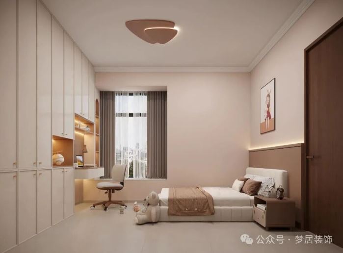 女兒房粉色搭配杏色的設(shè)計(jì)溫馨可愛,房間也定制了一整面收納柜,臨窗設(shè)計(jì)了懸空書桌,滿足小朋友的學(xué)習(xí)、閱讀需求??蓯鄣耐米优飚嫗榭臻g增添活力。