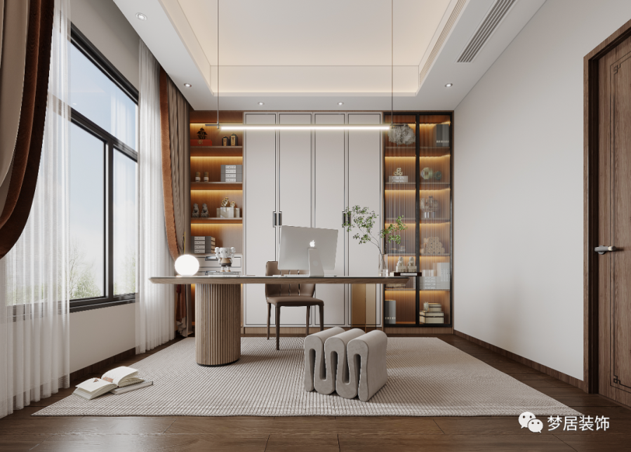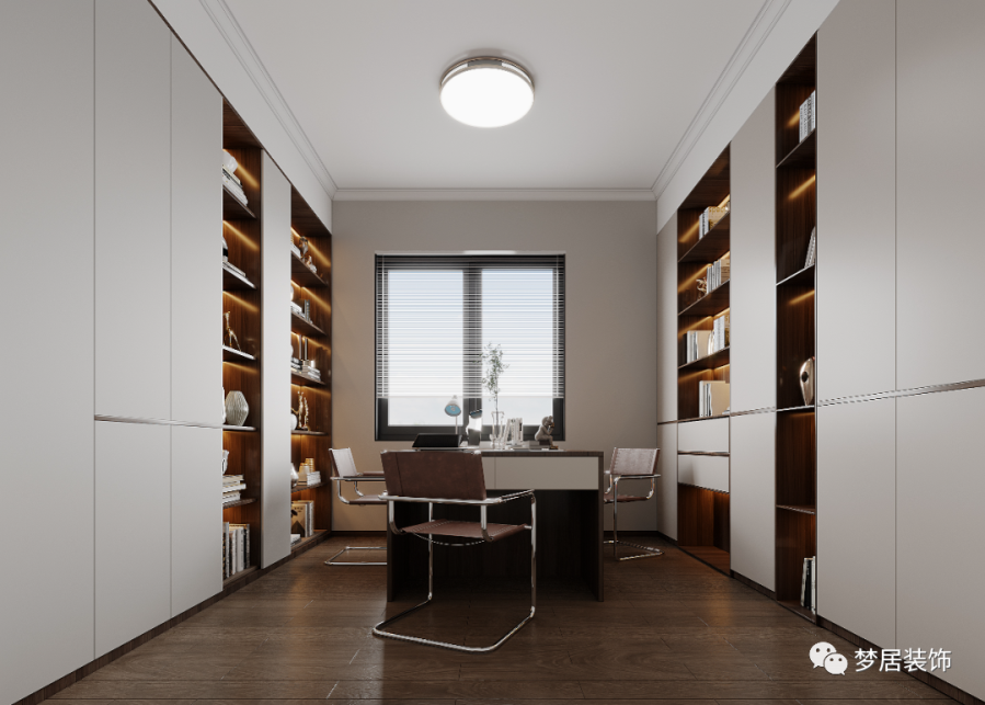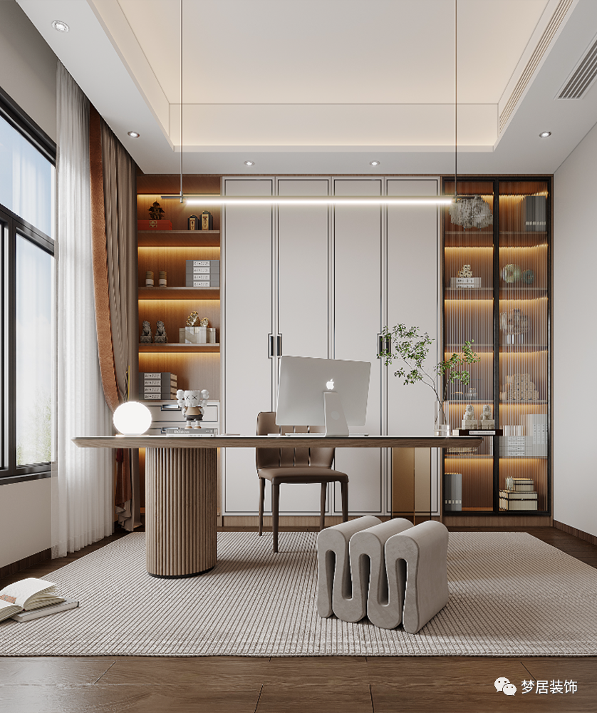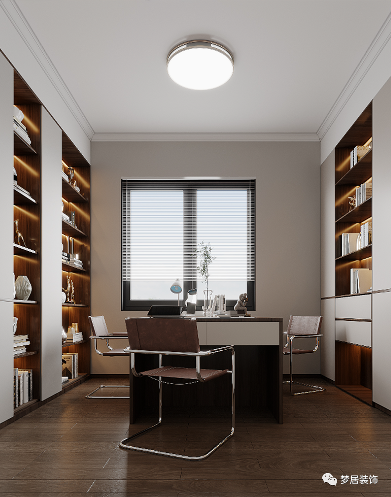 書房的設(shè)計自然優(yōu)雅,素凈內(nèi)斂的色彩散發(fā)出濃郁的書香氣息,淺色背景墻輔以木色大氣簡潔,素凈又純粹,有著君子般清逸脫俗的儒雅氣質(zhì)。