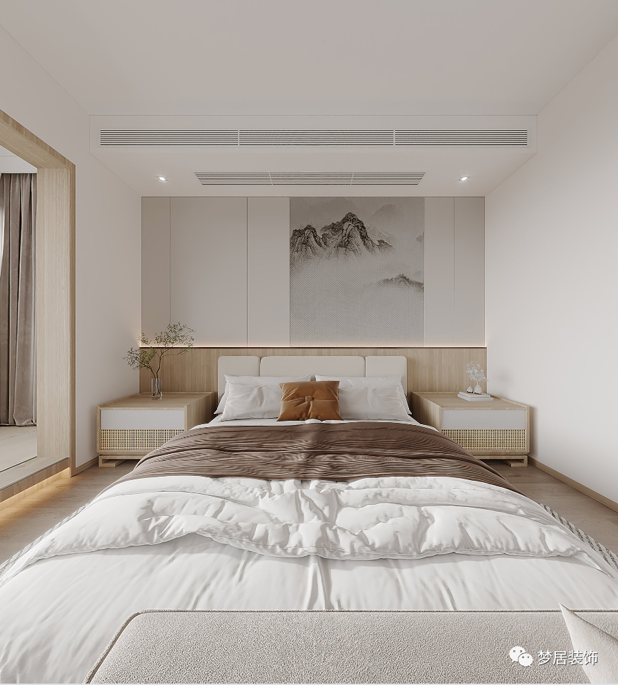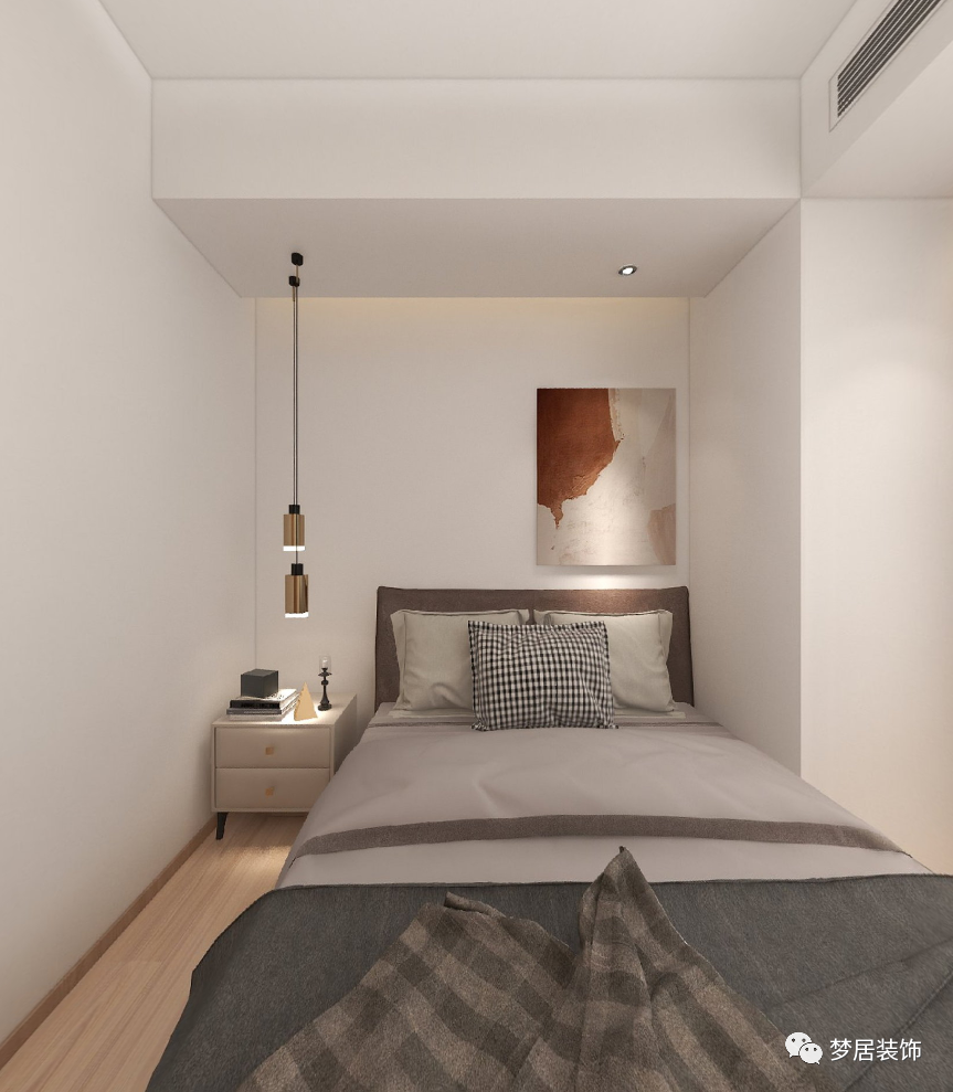 客臥溫馨自然、簡約大方,柔軟的布藝材質(zhì)豐富了整個空間質(zhì)感,極簡的線型吊燈和掛畫也讓整個空間增加了趣味。