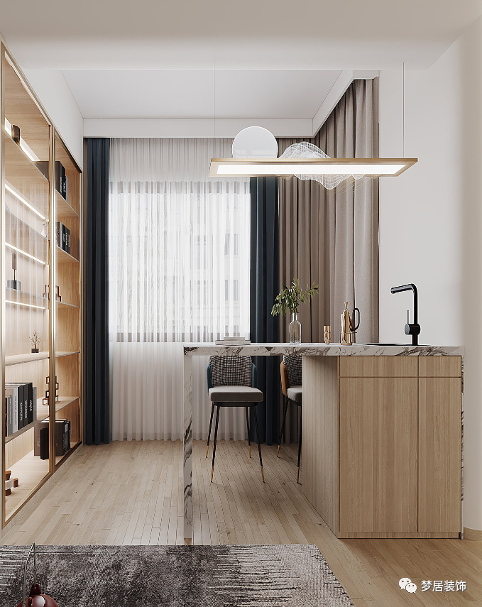 廚房以簡潔的線條分割營造干凈爽朗的空間感,大面積的木色溫潤了空間的的溫度,也提升了空間質(zhì)樸感受。