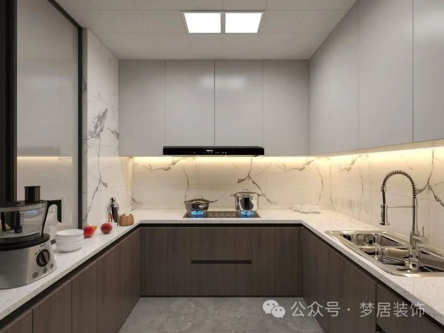 U型廚房布局簡約、實用、美觀,干凈的色彩搭配讓整個空間更簡約大氣。上下櫥柜做了顏色區(qū)分,烤漆面板防水耐磨也更易清潔,減輕日常家務。幾組櫥柜滿足收納功能,空間更加實用。