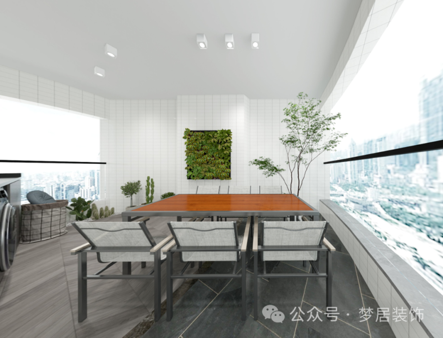 生活陽臺寬敞舒適,玻璃護欄讓空間更通透,擺放上綠植點綴,造型簡約的長桌椅打造出愜意、舒適的感受,給人一種入戶小花園的感覺,偶爾可以和家人或朋友開一個小小的陽臺派對,輕松又美好。
