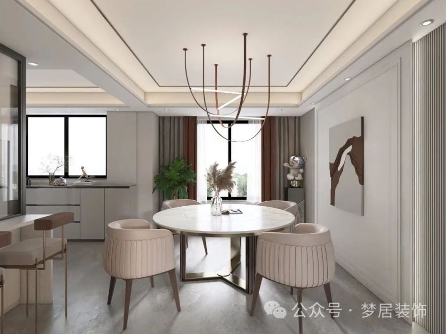 時尚的燈飾裝飾著餐廳,造型線條精致輕奢;圓形的餐桌搭配白色的座椅,簡約又優(yōu)雅。餐廳背景墻上的簡約裝飾畫,更顯得時尚個性;左面做了一個小吧臺。
