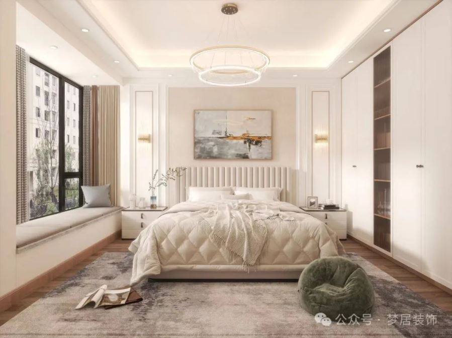 主臥作為私密的個人空間,彰顯居者的品味喜好。設計師以奶白色為肌底,金屬材質裝點其上,予人安謐的視覺享受以及復古摩登氣韻的蔓延,將日常生活情境與審美精神在同一范疇交融,融合紡織品輕奢的纖維質感,進一步增進空間的松弛感,墻面金屬裝飾線條及壁燈彰顯著輕奢奢華質感。