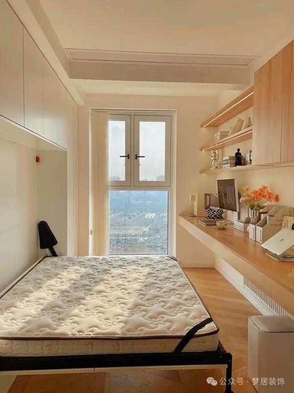這樣的話,可以根據(jù)房型靠墻一側(cè)設(shè)計(jì)吊柜和懸浮書桌,再擺放一張可折疊的隱形床,床與柜子形成一體設(shè)計(jì),也不會(huì)顯得突兀。