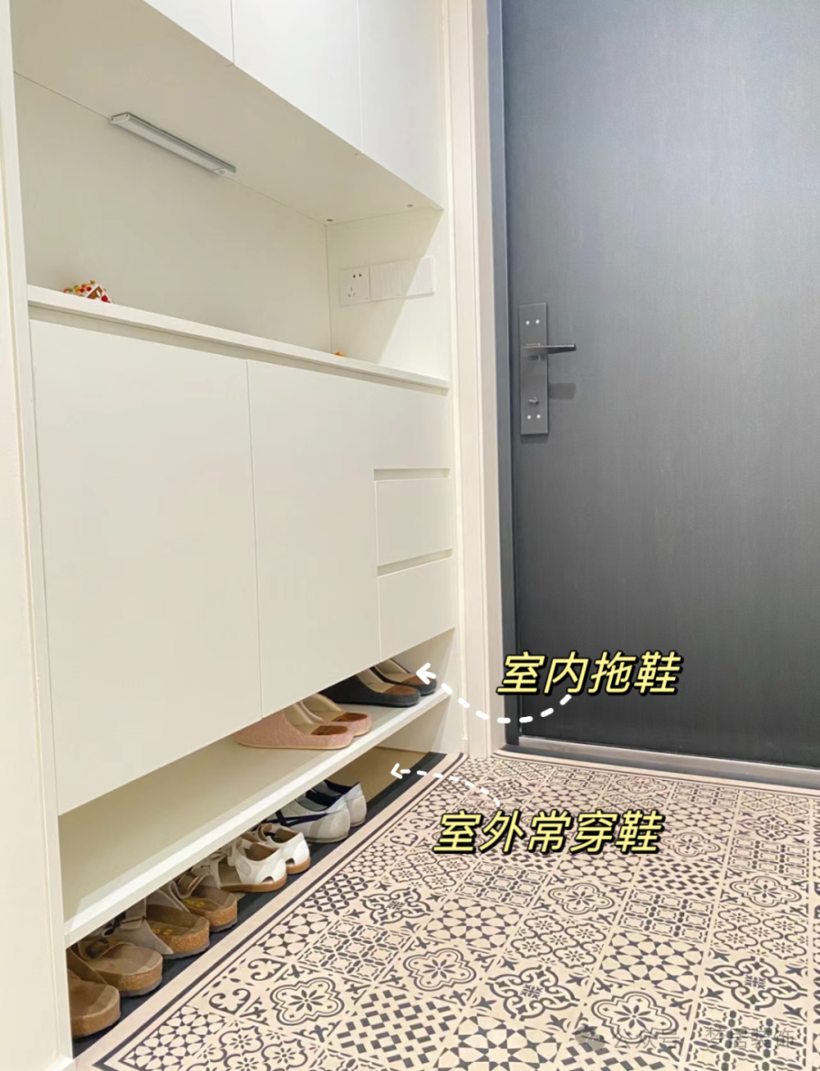 大多數(shù)家庭做玄關(guān)鞋柜底部都會懸空用來收納高頻使用的鞋很方便。