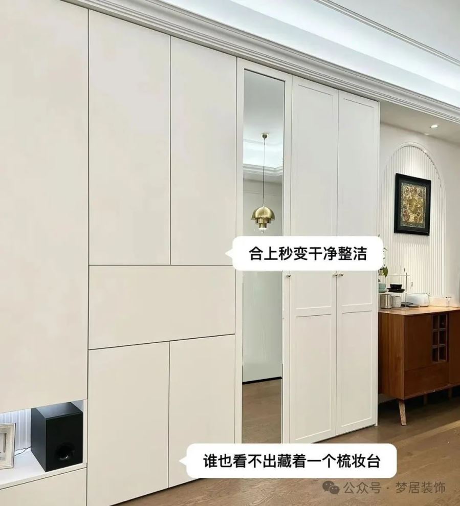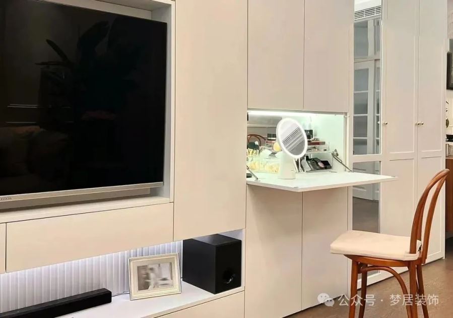 現(xiàn)在很多戶型都是大客廳小房間,小戶型就更加如此了,關(guān)于梳妝臺化妝桌放在哪這個問題,不如創(chuàng)新一下,直接做在衣柜里,合上柜門干凈整潔。