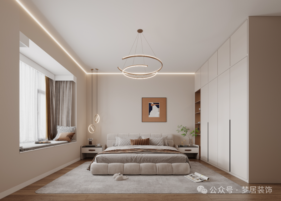 主臥空間延續(xù)了客廳的基礎(chǔ)色調(diào),空間明亮自然。深色的木地板和掛畫讓空間形成視覺對比,床頭的吊燈頗具時尚感,沒有過于復(fù)雜的裝飾,打造現(xiàn)代空間優(yōu)雅靜謐的舒適氛圍。