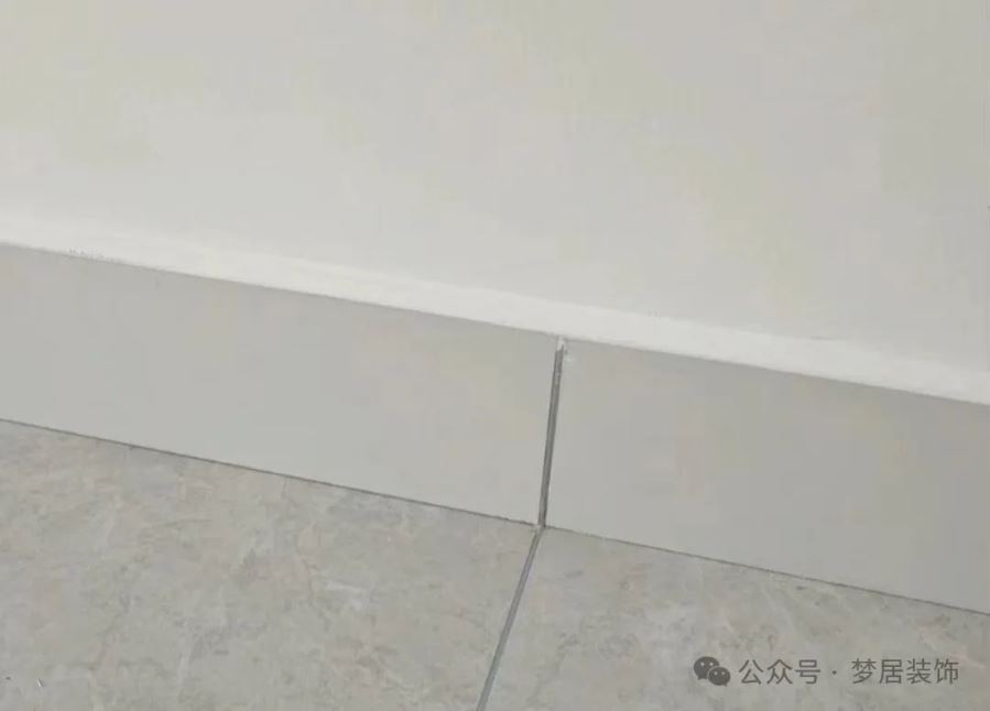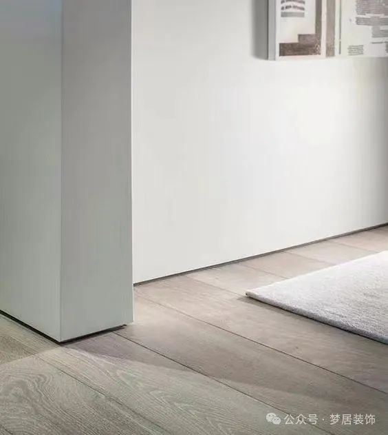 這種做法,一般使用樣式最簡單的、沒有任何裝飾線條的平板踢腳線,目的就是弱化存在感、不凸出墻面。在墻底開槽,把踢腳線放進去,開槽高度基本和踢腳線高度一致,最終完成以后,踢腳線和墻體之間只會留一道極細的小縫。