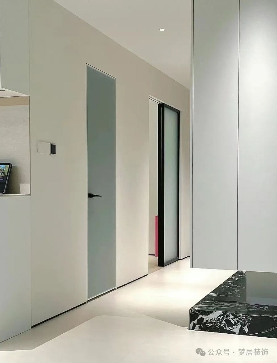 不如選擇吊軌安裝,將軌道隱藏安裝在推拉門的頂部,好處是地面無軌道、無死角,方便地磚通鋪更美觀。
