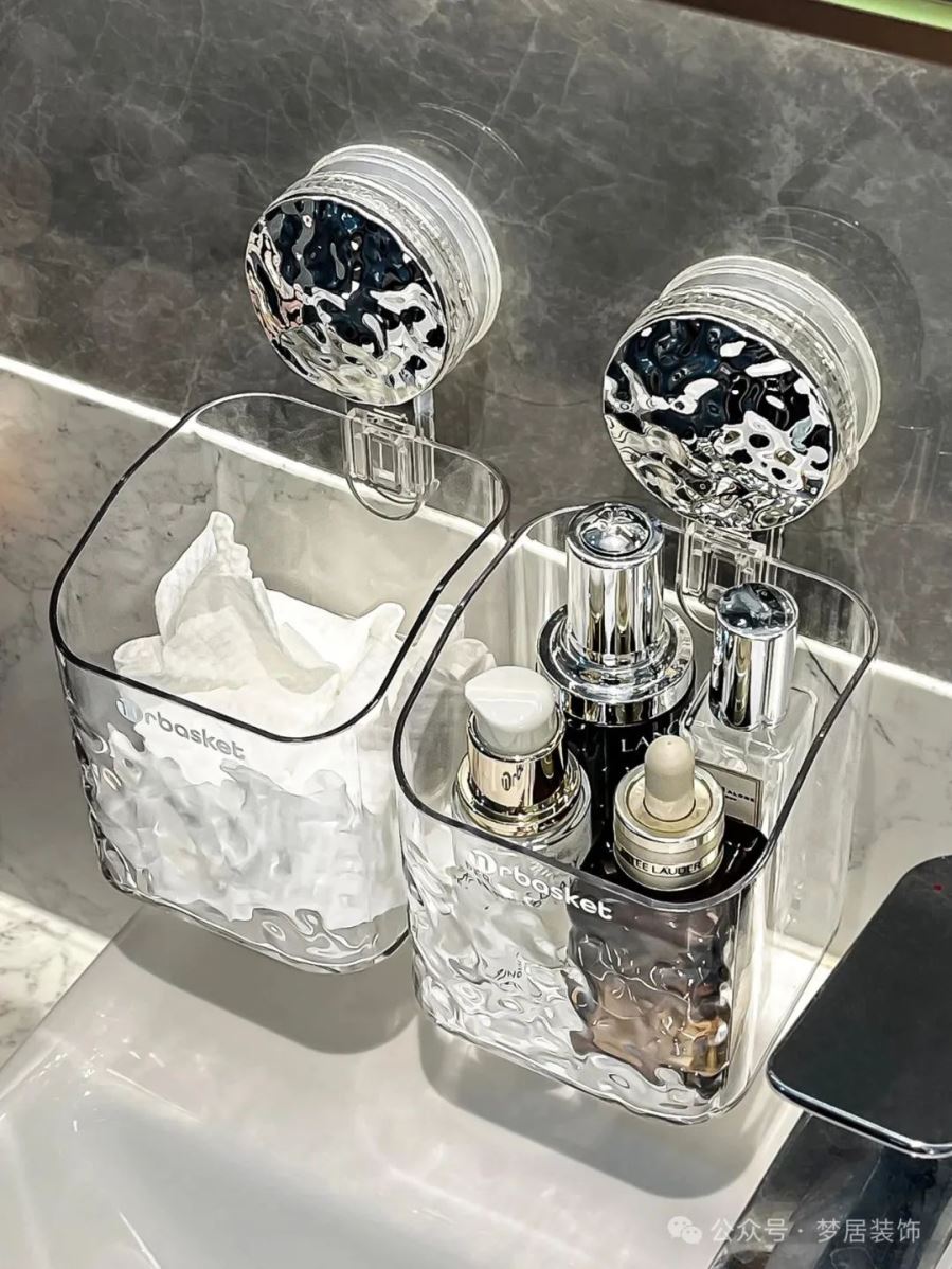 縱向增加收納,利用掛籃將洗面奶、洗手液等一些常用的洗護用品一起存放,也可以避免放在洗手臺上積水漬造成泛黃。