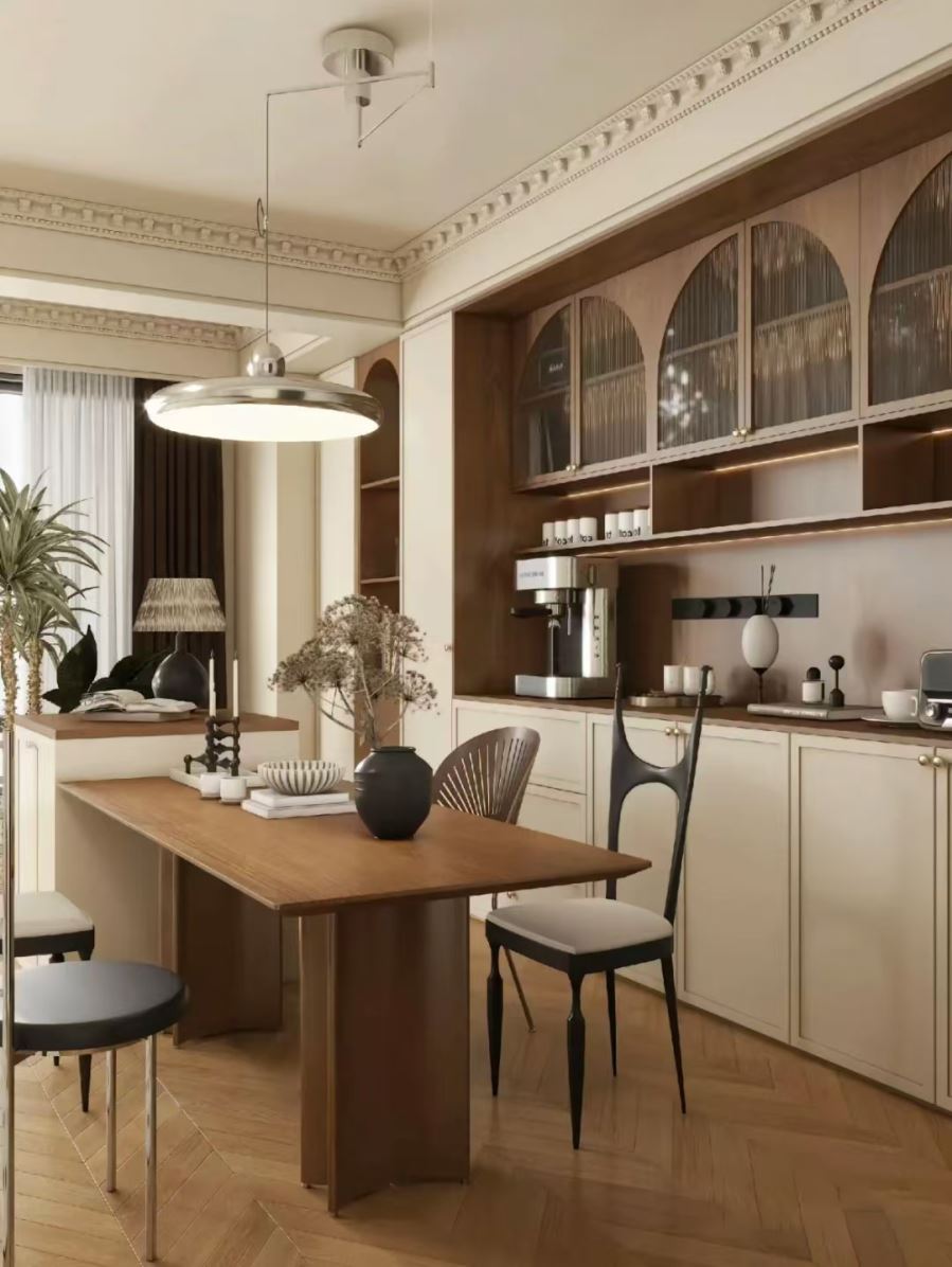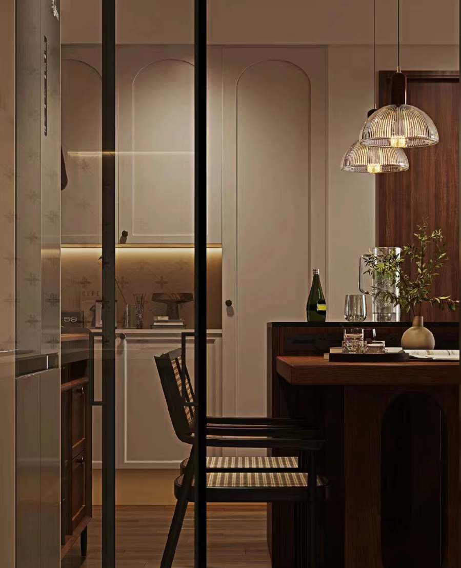 通過(guò)簡(jiǎn)化造型與裝飾,讓整個(gè)空間的基調(diào)呈現(xiàn)出一種優(yōu)雅低調(diào)、克制內(nèi)斂的氣息,在不經(jīng)意間散發(fā)出摩登復(fù)古的美學(xué)氣質(zhì)。