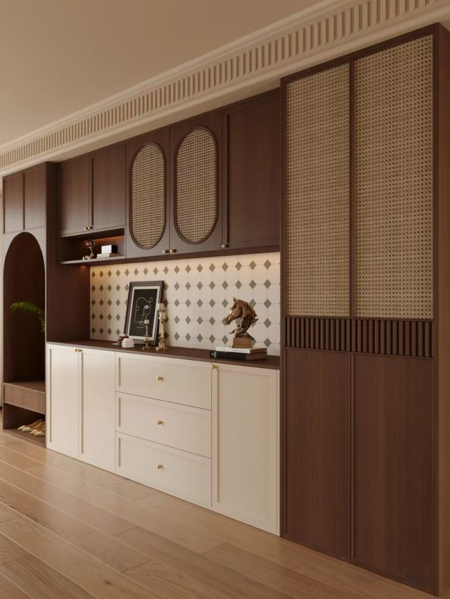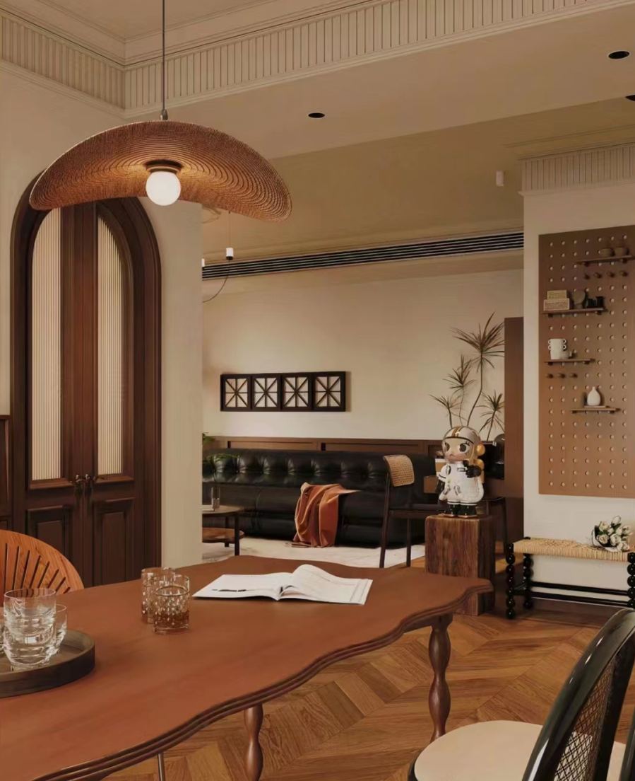 除此以外,在一些軟裝配置和家具上還會(huì)采用藤編、麻布等自然質(zhì)感的材料,營(yíng)造出復(fù)古懷舊的質(zhì)感。