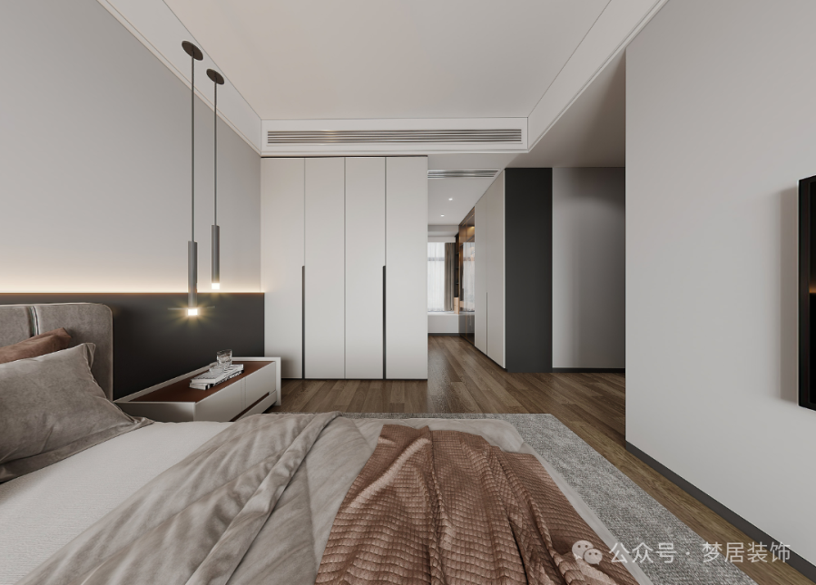 衛(wèi)生間過道較寬闊,靠近衛(wèi)生間墻面全部打上衣柜,收納功能滿分!臥室不管是功能性還是美觀性都得到滿足,有效提升居住的舒適感。