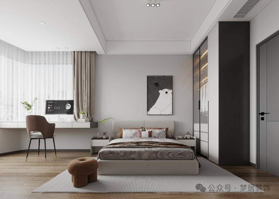 兒童房原來的陽臺也一并并入室內(nèi)空間,打造學(xué)習(xí)區(qū)與收納區(qū)。木色與淺灰的碰撞讓臥室看起來更高級。