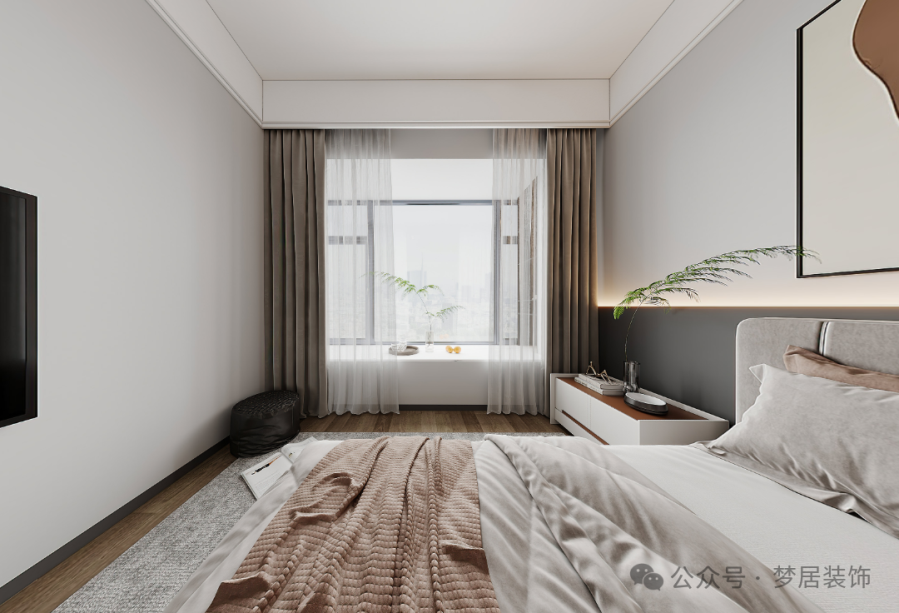 臥室選擇木地板,溫潤舒適,木質(zhì)紋理和色澤為空間增添了溫馨質(zhì)樸的感受。