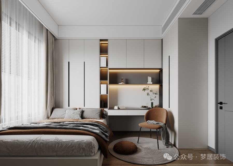 另一間兒童房選擇榻榻米設(shè)計,滿墻衣柜收納功能十足。淺灰色調(diào)的設(shè)計加入棕色打破空間沉悶感,氛圍很充足。暗藏的暖光燈帶讓溫暖舒適的氛圍散發(fā)開來。