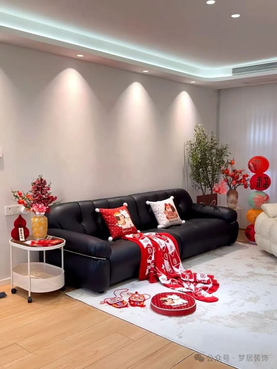 抱枕與搭毯:無需將整個沙發(fā)換成紅色,沙發(fā)添幾個紅色抱枕或一張毛絨絨的搭毯,就能輕松營造出新年的氛圍。