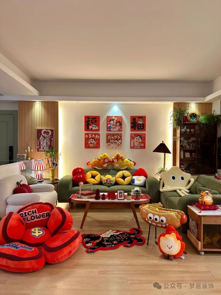 客廳作為日?;顒拥闹匾獔鏊煤唵蔚匈|感的局部裝飾來布置一下,新年新氣象,讓年味恰到好處。選擇一些寓意吉祥的小掛飾、擺件、鮮花綠植等單品,讓家里的新春布置熱鬧且喜慶。
