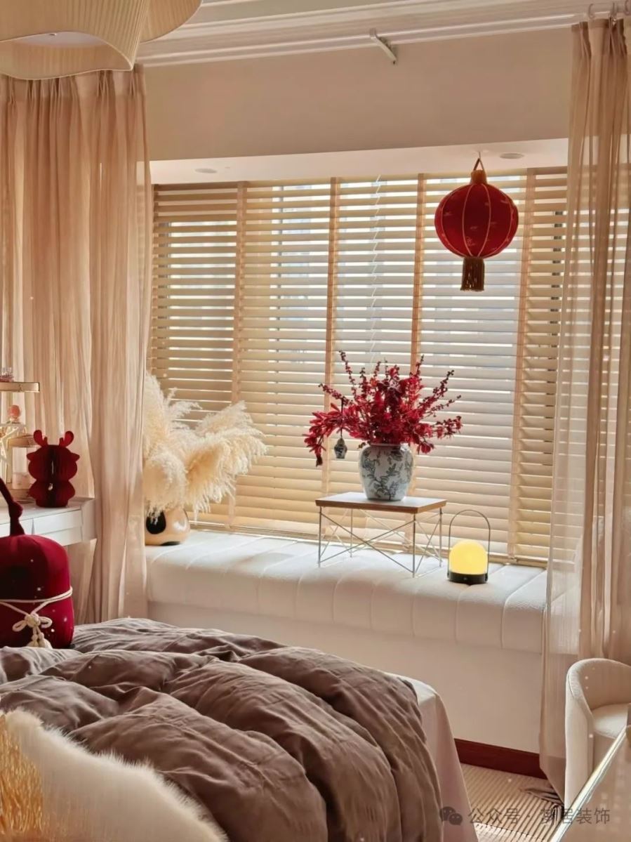 臥室不需要過多的變動,在原有的基礎上做"加法",擺放新年裝飾物,添加一些紅色的元素,滿滿的新年氣息。